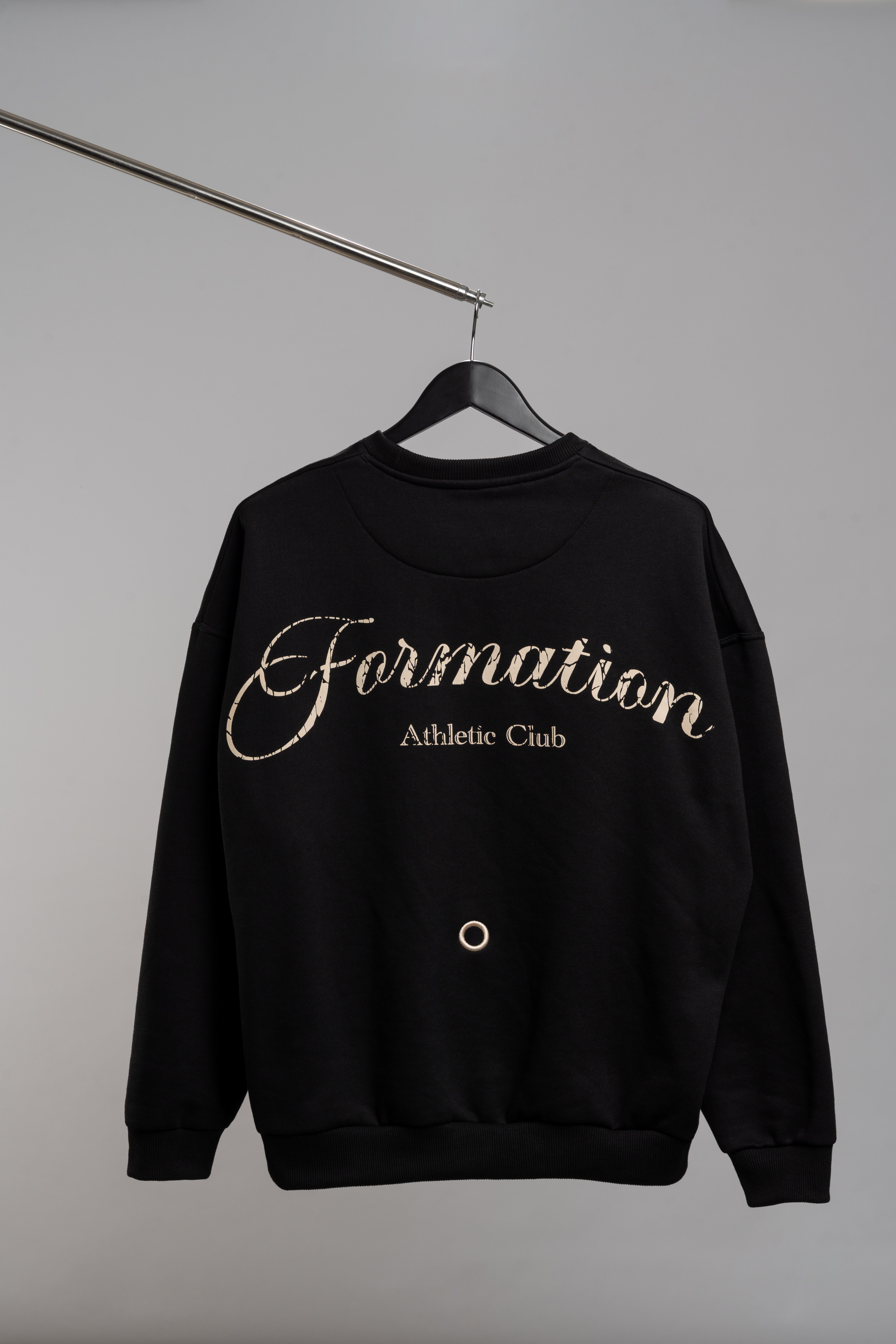 A black oversized fit sweater which features an embroidered formation athletic club logo on the front left chest and a distressed F.A.C. logo across the back in an off white colour.