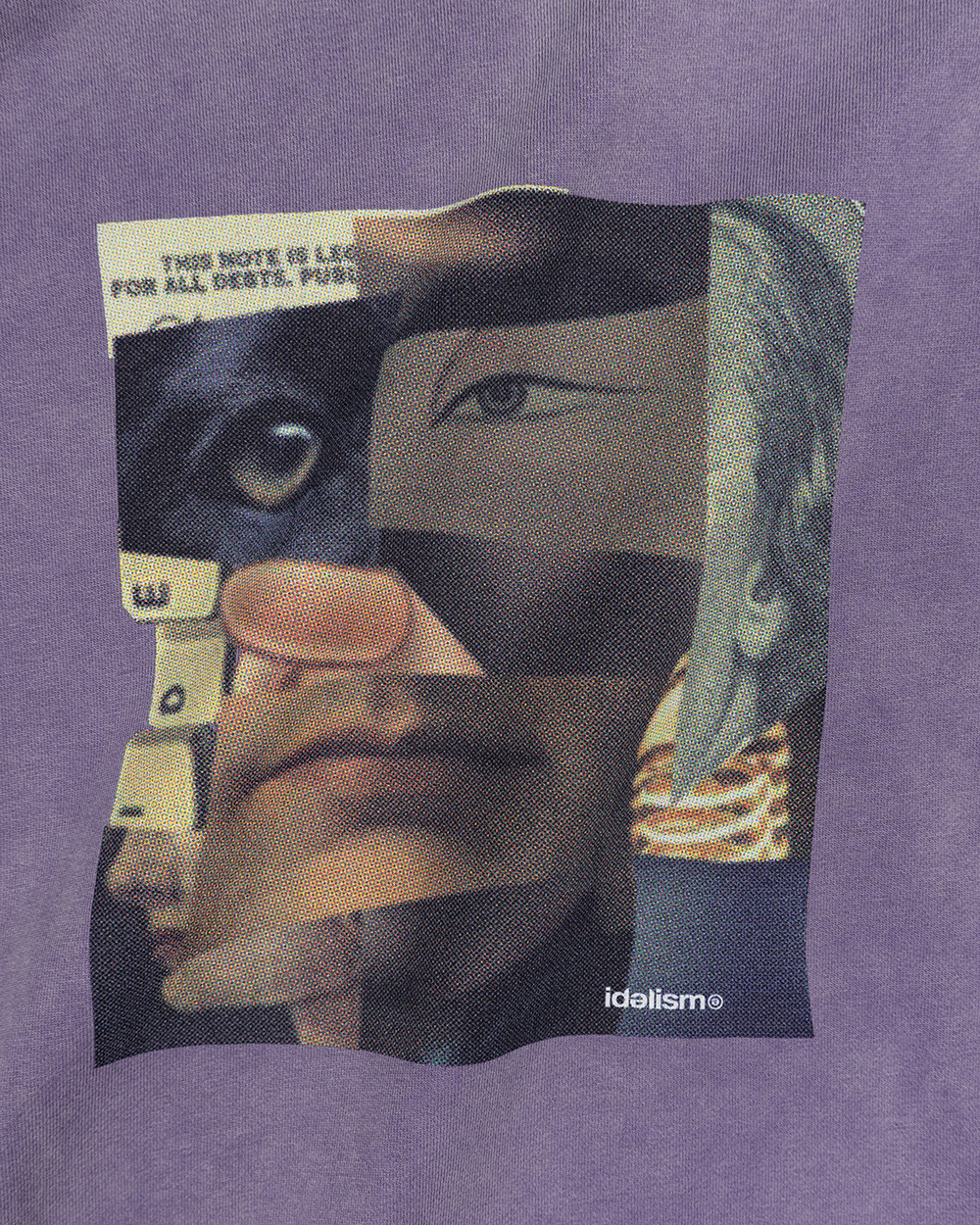 以圖像拼貼為核心視覺,透過碎裂交疊組合,敘述當代資訊爆炸與交錯的狀態細節,拼貼延伸所見而形成主觀意識。水洗工藝為整體加入時間痕跡,柔化略顯尖銳的議題,轉爲經時間鎖封存的過往,靜靜映照虛實交織下的複雜面貌。而回歸日常之中,服裝成為故事的載體,賦予了更多元的想像空間。