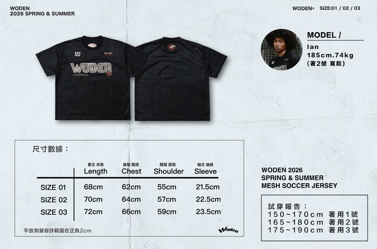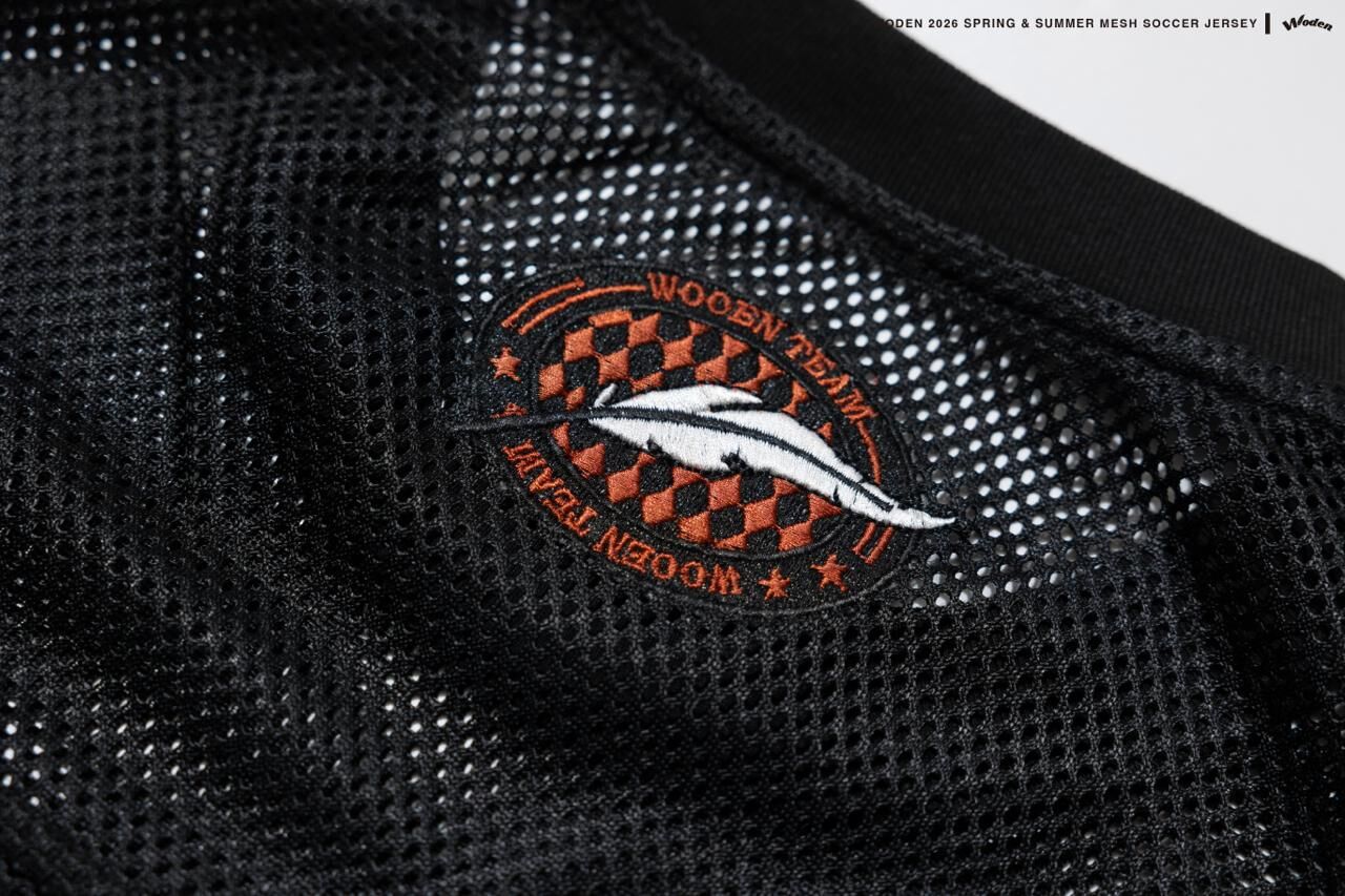 本次網洞足球衫以修飾比例的寬短版輪廓為基礎,細節延續經典足球衫排版邏輯。胸前配置 WODEN 復古線條 LOGO 印花,上方左右分別加入 WD LOGO 與標語刺繡,透過標誌堆疊,強化整體層次感。背面領下則點綴羽毛圖騰刺繡,低調提升品牌辨識度。