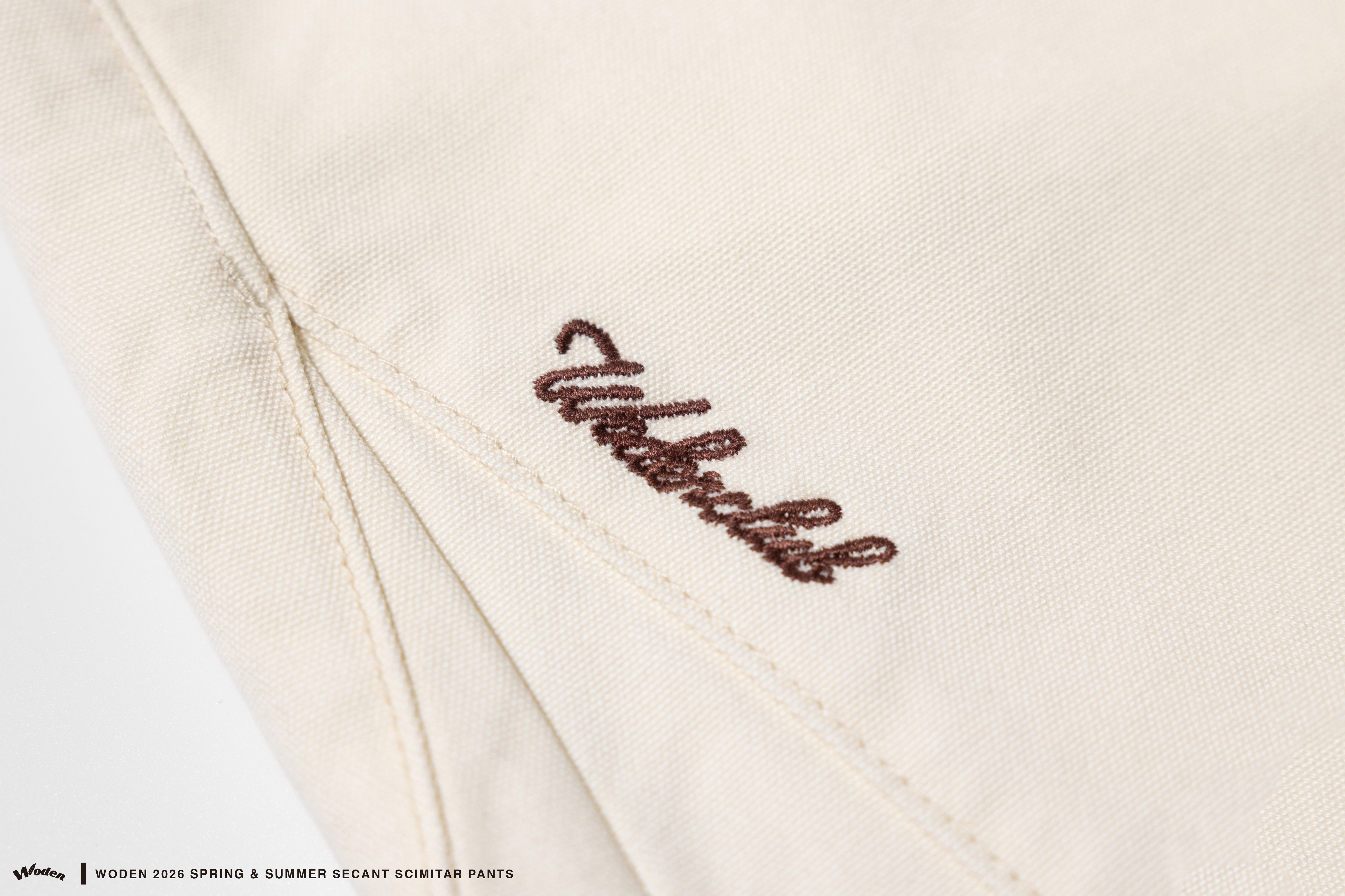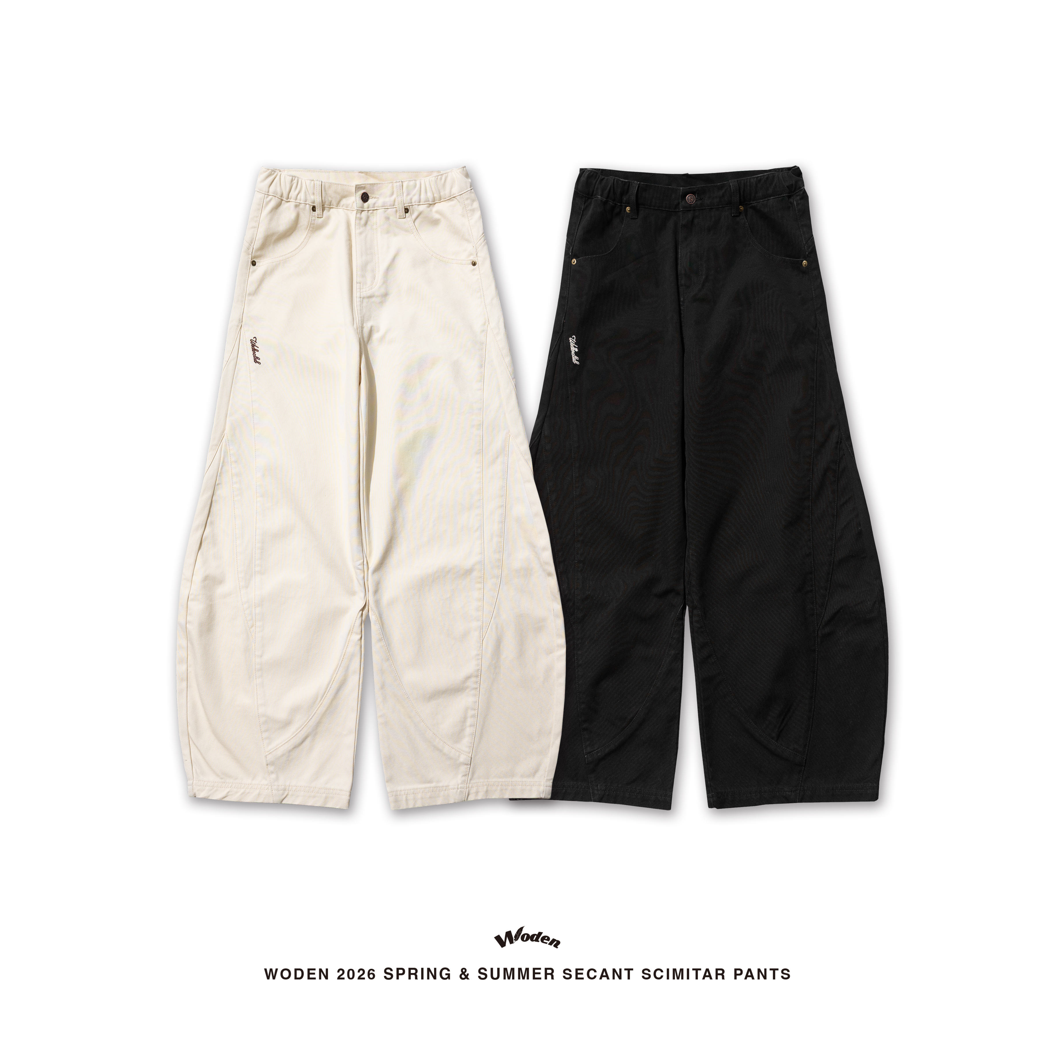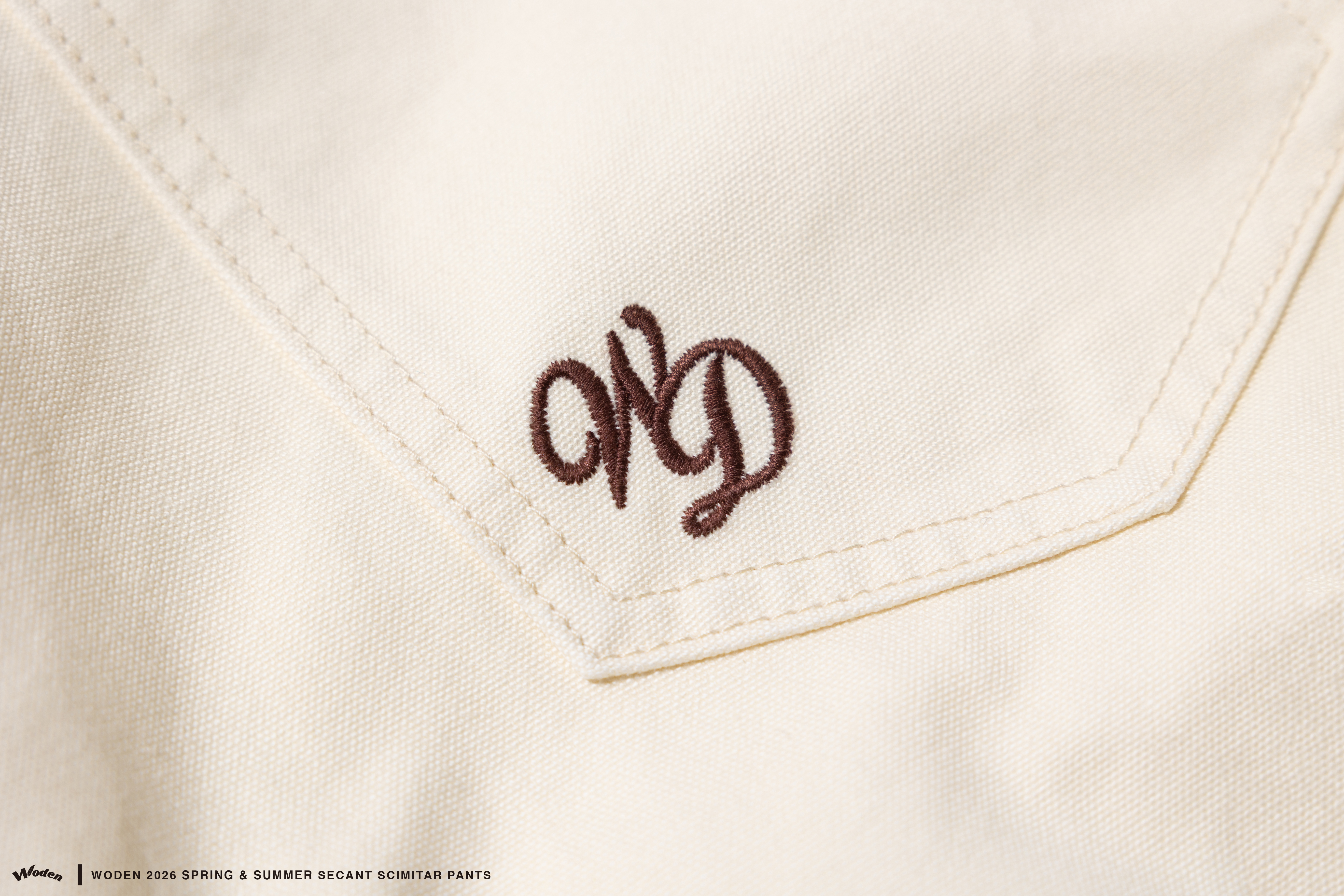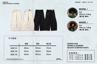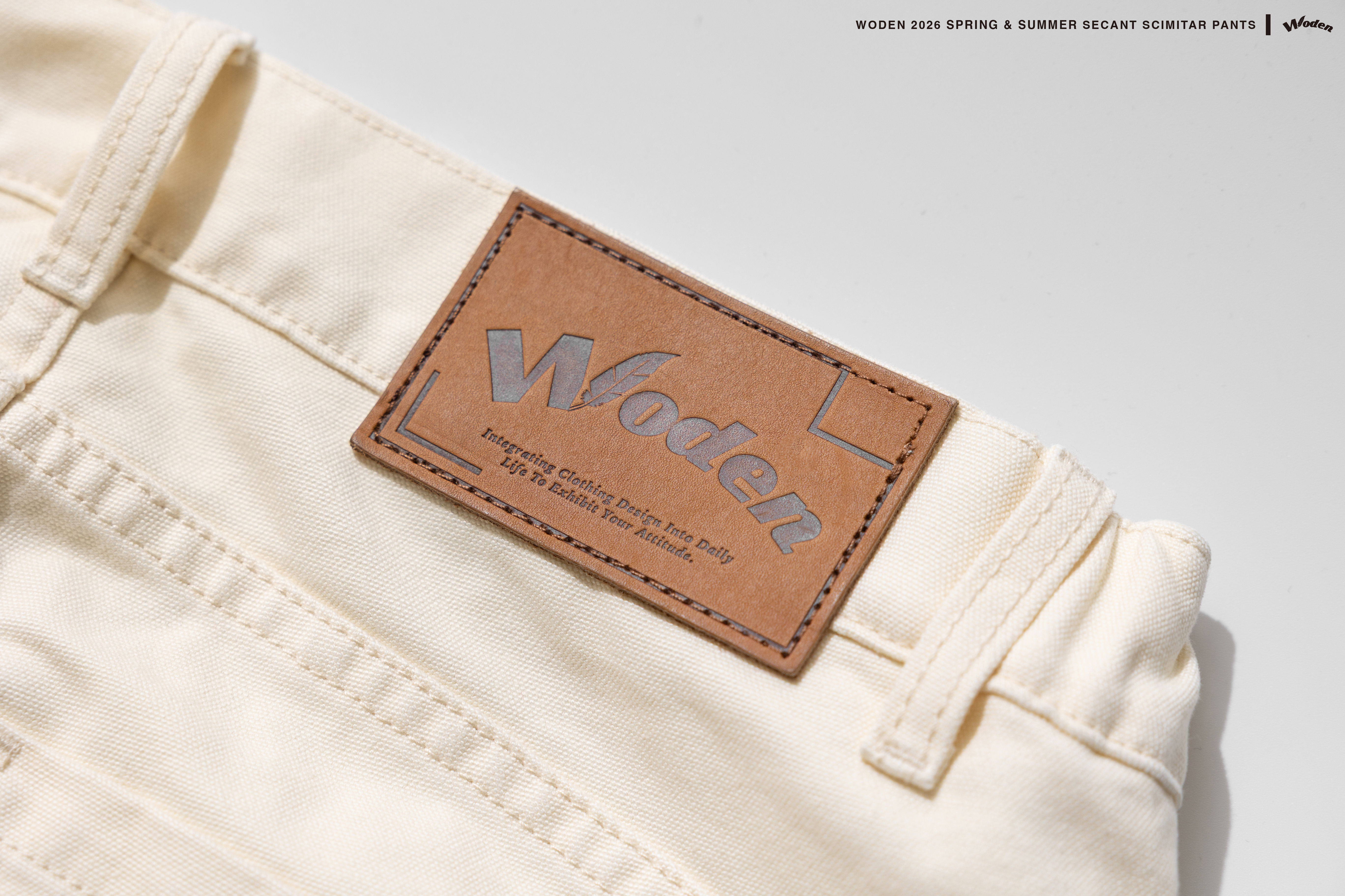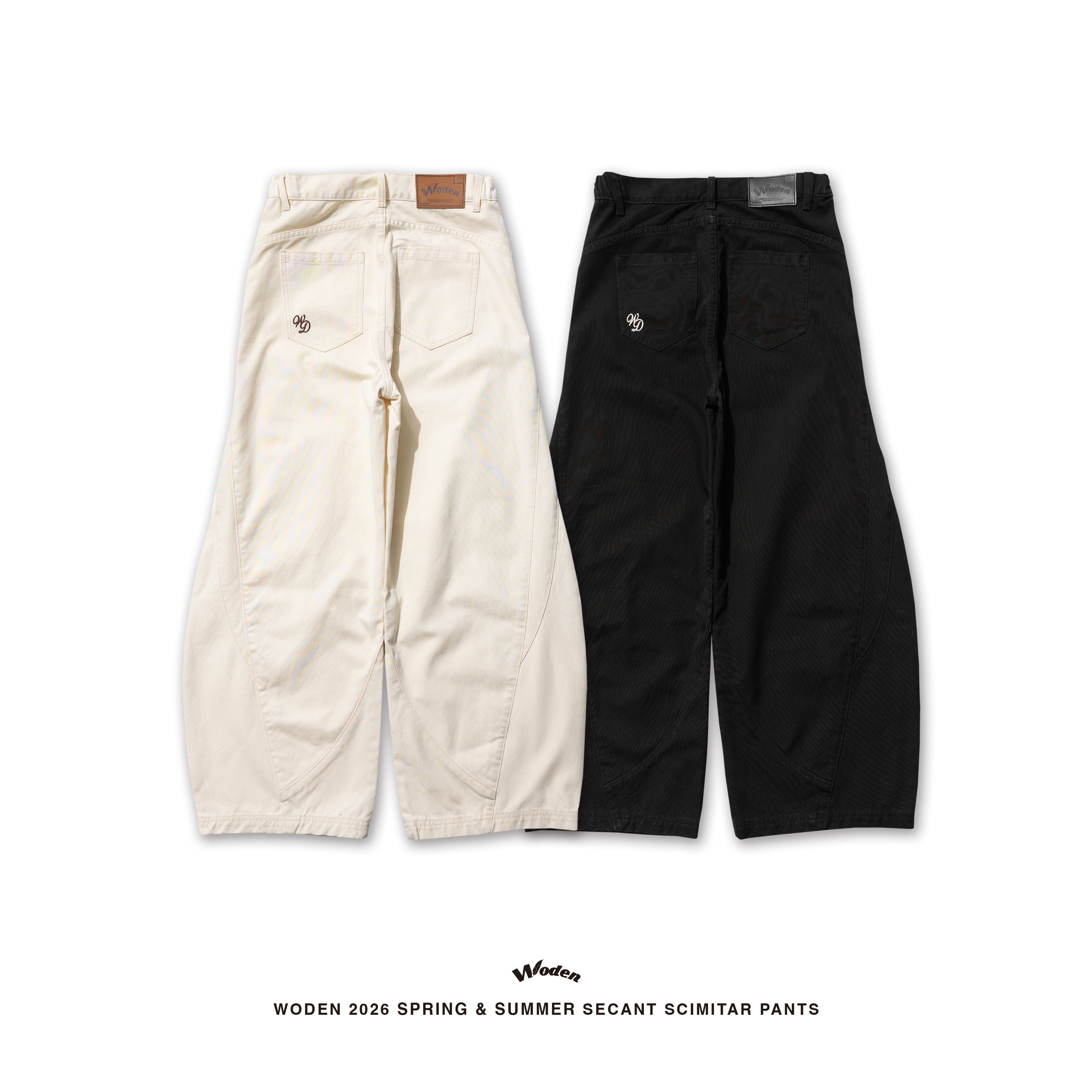 褲身透過弧形剪裁勾勒出流動且立體的褲型曲線,褲身正反面皆加入立體拼接與割線縫線,強化整體層次與結構感。搭配硬挺耐磨的珠帆布面料,使下身輪廓更加俐落有型。細節部分,正面口袋下方點綴草寫 WODEN 雕花刺繡,背面口袋則加入 WD 雕花標誌,前後細節相互呼應;再結合經典皮革標,完整堆疊出屬於工裝單品的細節厚度。
