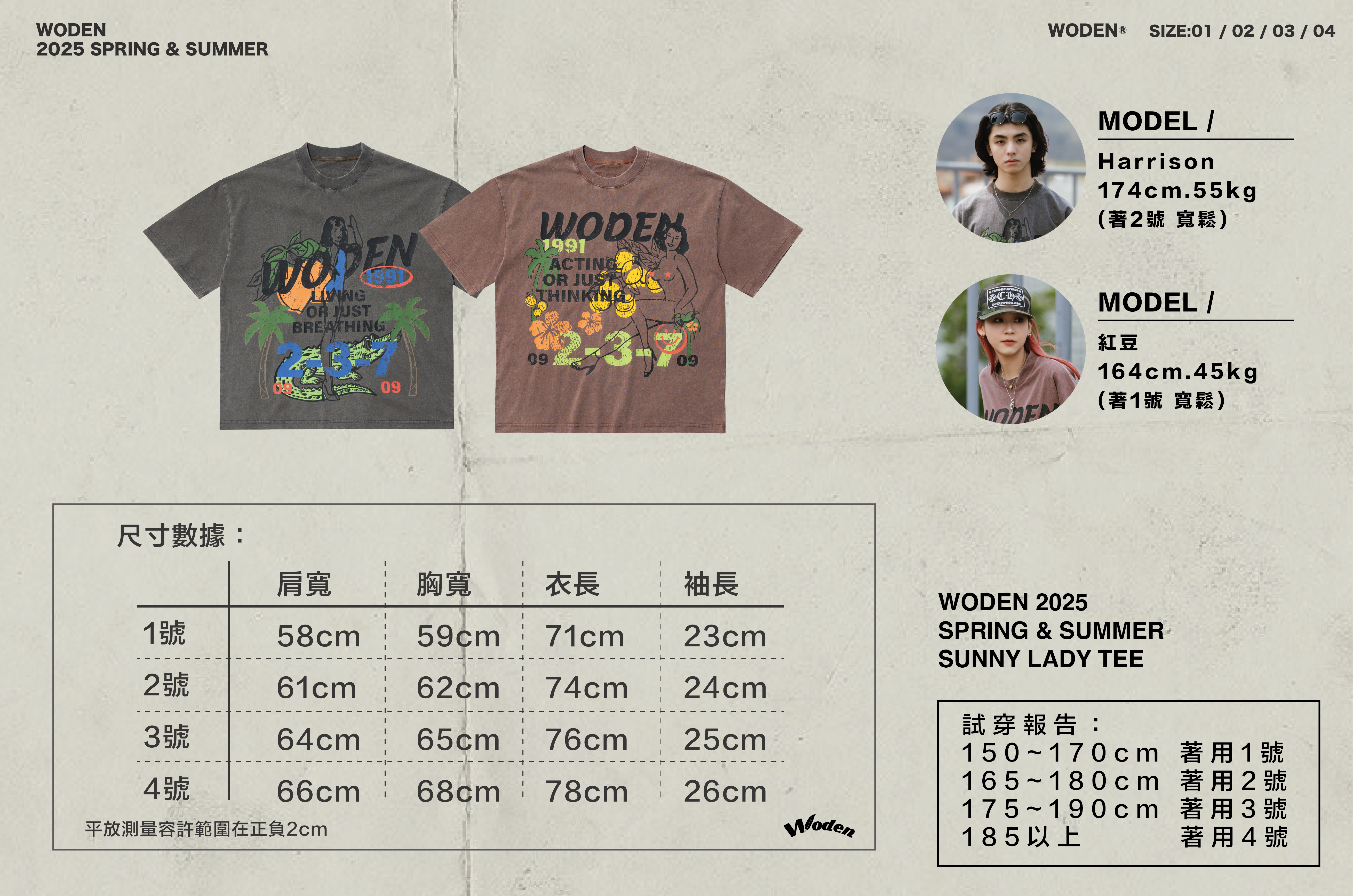 本次T-shirt設計以「Pin-up Art 海報女郎」作為視覺主題,正面以大幅圖像與文字排版結合呈現,將經典海報女郎形象融合樸桑花、棕櫚樹等熱帶元素,並搭配WODEN專屬字體設計,形塑強烈的視覺張力與品牌辨識度。圖像採用「破壞水漿印花」工藝,透布底印花搭配仿舊破壞質感,營造出色落斑駁的復古效果;整體衣身則經過炒鹽洗水處理,帶出自然做舊的質感層次,提升整體年代感氛圍。