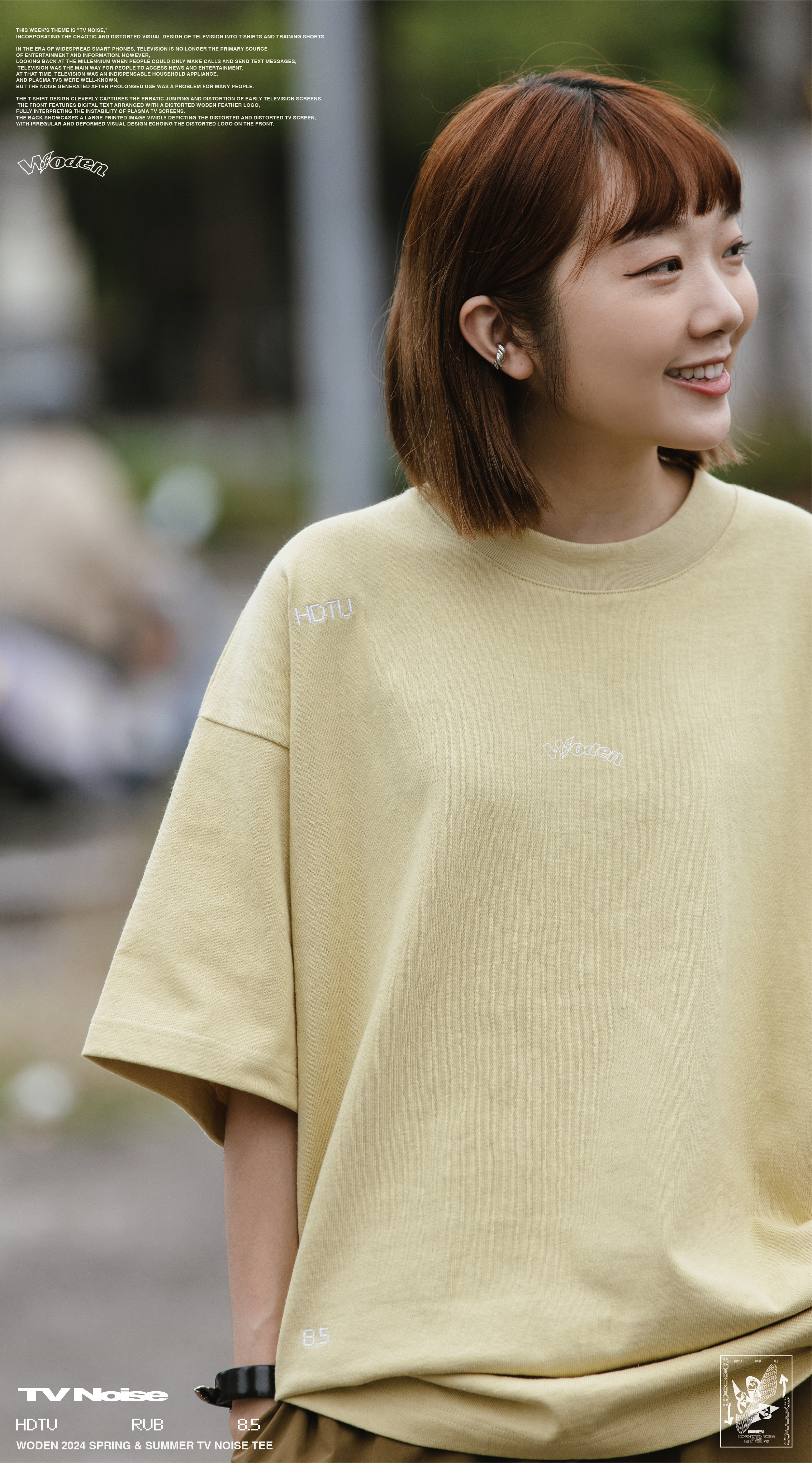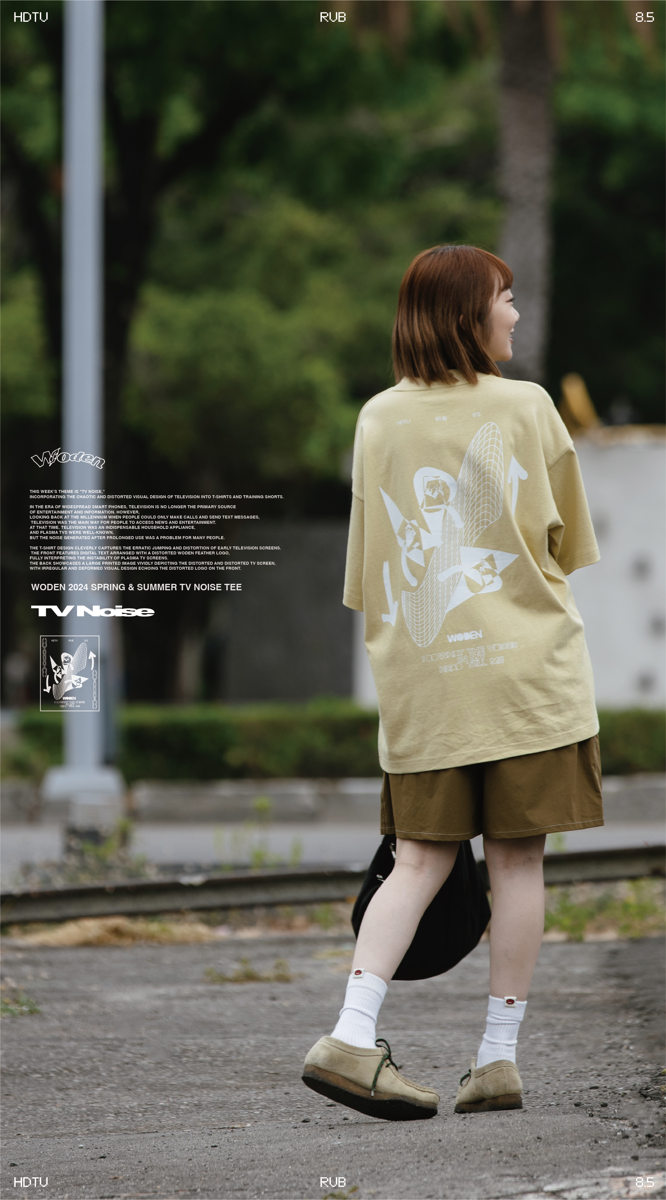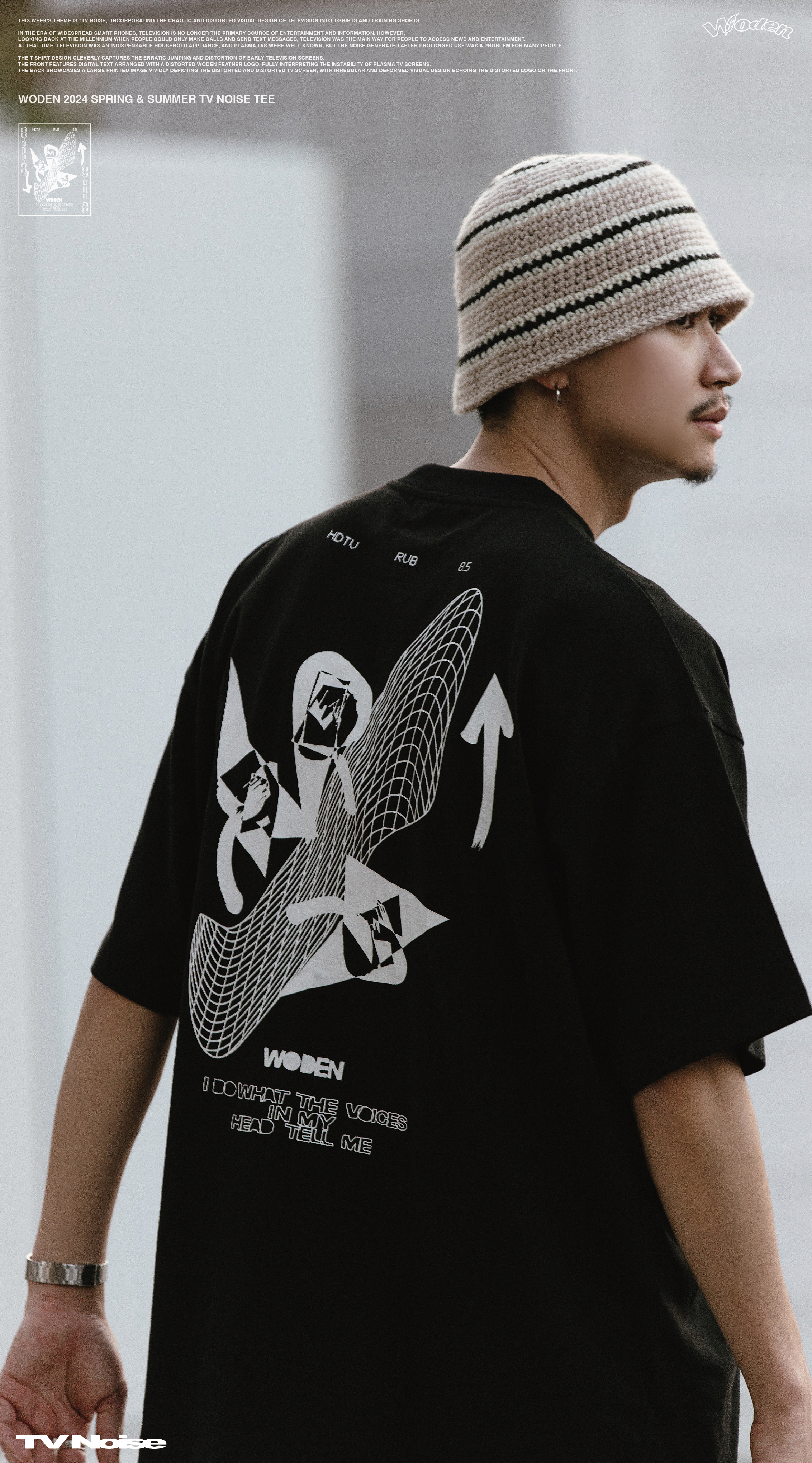 T-shirt圖像巧妙地呈現了早期電視不定期畫面亂跳和扭曲的感覺。正面以數位文字排列,加上扭曲的WODEN羽毛LOGO,完整地詮釋了電漿電視畫面的不穩定性。背面則以大圖印刷方式展現,生動呈現了電視扭曲和失真的畫面,不規則且變形的視覺設計與正面扭曲LOGO互相呼應。