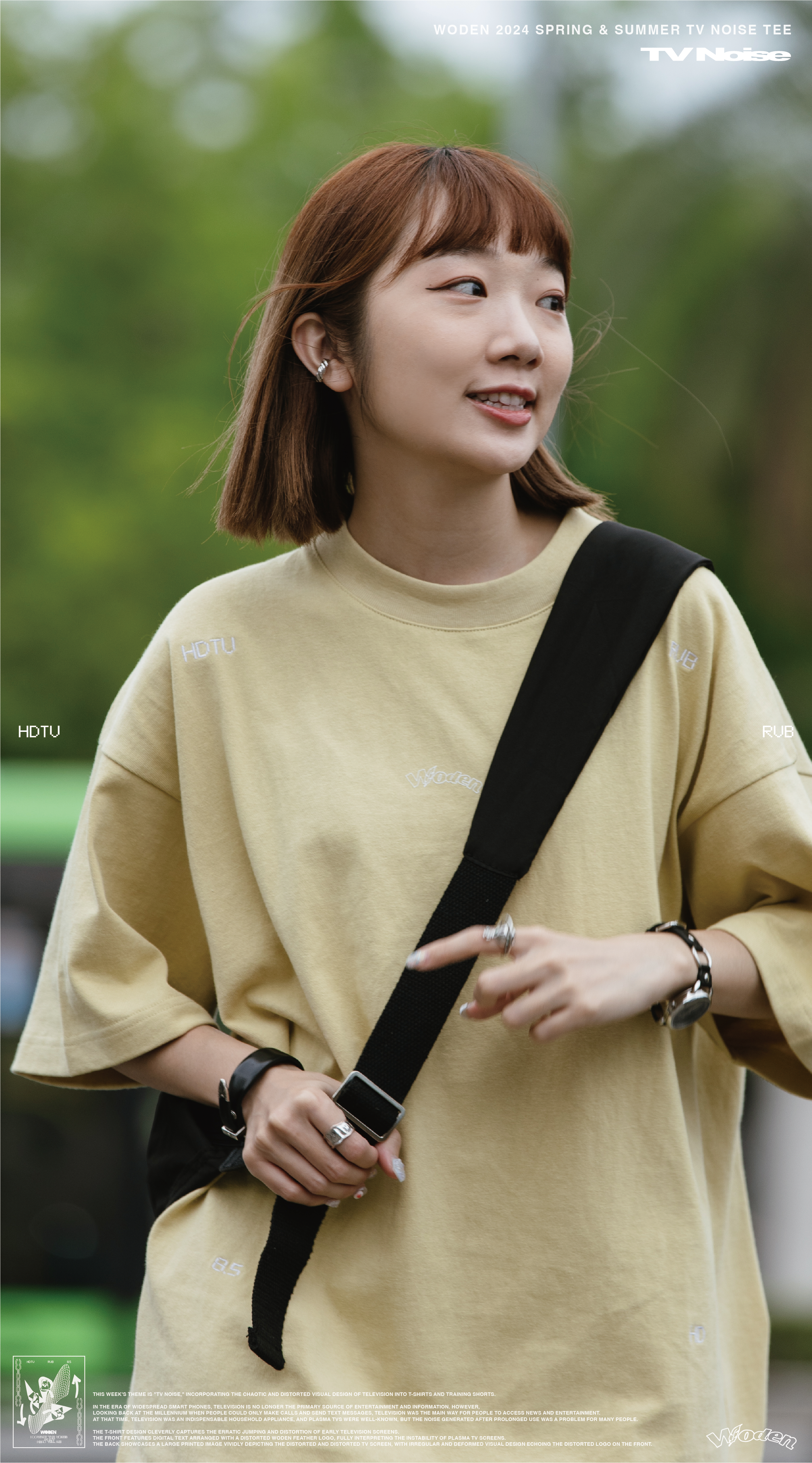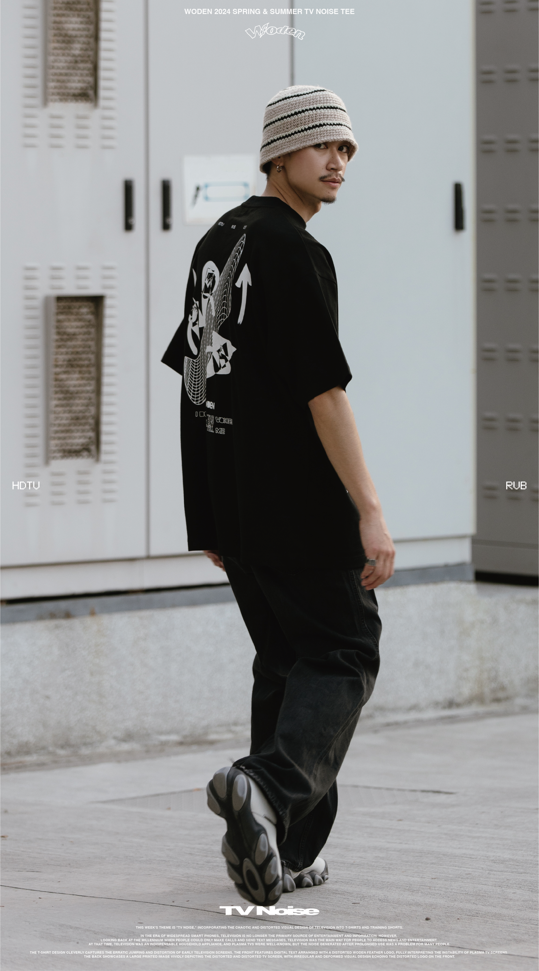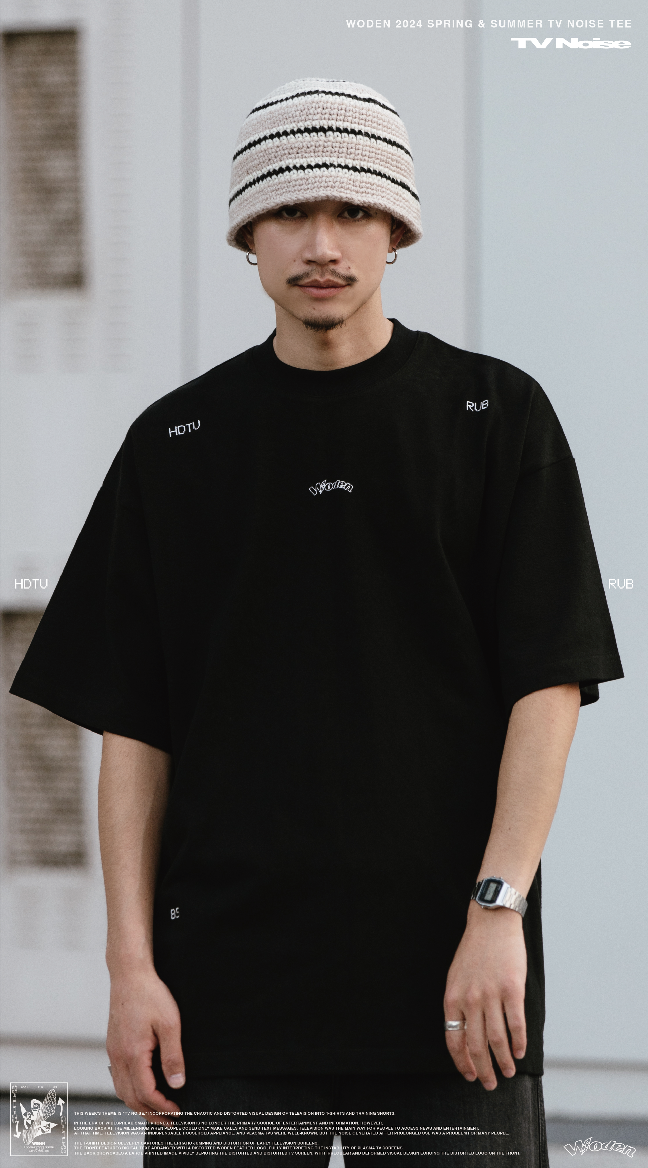 T-shirt圖像巧妙地呈現了早期電視不定期畫面亂跳和扭曲的感覺。正面以數位文字排列,加上扭曲的WODEN羽毛LOGO,完整地詮釋了電漿電視畫面的不穩定性。背面則以大圖印刷方式展現,生動呈現了電視扭曲和失真的畫面,不規則且變形的視覺設計與正面扭曲LOGO互相呼應。